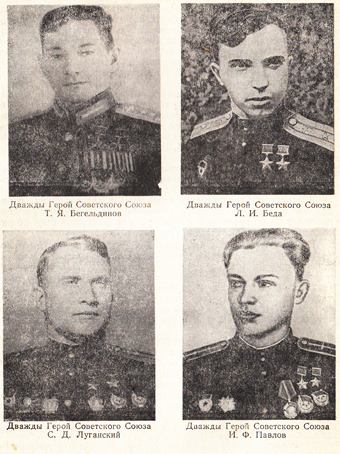 За героизм, проявленный в боях с гитлеровскими захватчиками, около 500 воинов-казахстанцев были удостоены звания Героя Советского Союза, среди которых славные дочери казахского народа — Маншук Маметова и Алия Молдагулова; четырем соколам советской авиации — С. Д. Луганскому, Т. Я. Бегельдинову, И. Ф. Павлову и Л. И. Беде —высокое звание присваивалось дважды.