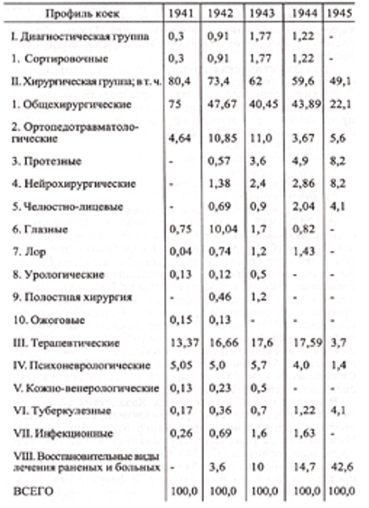 Из таблицы видно, что наибольший объем оказания этого вида медицинской помощи раненым и больным в эвакогоспиталях республики был в 1942-1943 годах, с 1944 года он начал сокращаться в связи с уменьшением поступления раненых и больных. Изменение процентного соотношения специализированных коек было связано с характером поступившего контингента. Таким образом, госпитальные койки Казахстана имели следующий профиль: