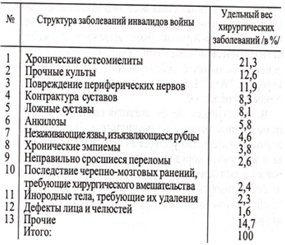 Если до 1964 г. преобладающими видами заболеваний инвалидов войны были хирургические, то, начиная с 1964 г. — терапевтические (39,4%), второе место занимали хирургические (23,1%) и третье — нейрохирургические (15,4%). В связи с уменьшением числа инвалидов войны с ортопедохирургическими заболеваниями снизился процент оперативных вмешательств. До 1949 г. число операций возрастало (в 1948 г. — 54,4%, в 1949 — 56%), с 1950 г. начался постепенный их спад с 47,2% до 13% в 1965 г. Это объясняется тем, что большинство инвалидов войны с хирургическими заболеваниями подвергались радикально-хирургическому вмешательству и санированию.